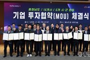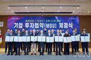 동네방네 김형규 기자 | 국내외 기업 투자 유치를 핵심 과제로 추진 중인 충남도가 이번엔 14개 기업으로부터 5000억 원 이상의 투자를 이끌어내며 충남의 지속 가능한 미래 발전 발판을 다졌다. 김태흠 지사는 26일 도청 대회의실에서 김석필 천안시장 권한대행 등 6개 시군 단체장 또는 부단체장, 이동주 성창오토텍 대표이사 등 14개 기업 대표와 투자협약을 체결했다. 협약에 따르면, 14개 기업은 2029년까지 6개 시군 산업단지 등 50만 64㎡의 부지에 총 5090억 원을 투자해 생산시설을 신·증설하거나 이전한다. 이들 기업이 계획대로 가동할 경우 신규 고용 창출 인원은 526명으로 예상된다. 천안 북부BIT일반산단에는 4개 기업이 생산시설을 신·증설한다. 자동차용 부품업체인 성창오토텍이 2만 3225㎡부지에 542억 원을 투자해 공장을 새롭게 만든다. 또 반도체·PCB 표면 처리 장비 전문업체인 하이쎄미코가 132억 원을 투자해 6311㎡부지에 공장을 신설하며, 산업용 로봇 제조업체 아라는 100억 원을 투자해 1100㎡부지에 생산시설을 확장한다. 수입 과일