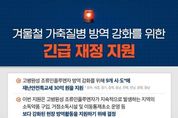 동네방네 김형규 기자 | 겨울철 가축질병 방역 강화를 위한 긴급 재정 지원 - 고병원성 조류인플루엔자 방역 강화를 위해 9개 시·도*에 재난안전특교세 30억 원을 지원 *광주, 세종, 경기, 충북, 충남, 전북, 전남, 경북, 경남 - 이번 지원은 고병원성 조류인플루엔자가 지속적으로 발생하는 지역의 소독약품 구입, 거점소독시설 및 이동통제초소 운영 등 보다 강화된 현장 방역활동을 지원하기 위해 결정 - 행안부는 지난해 11월 24일에 14개 시·도에 고병원성 조류인플루엔자 확산 방지를 위한 재난안전특교세 50억 원을 지원했으며 이번까지 포함하면 총 80억 원을 지원