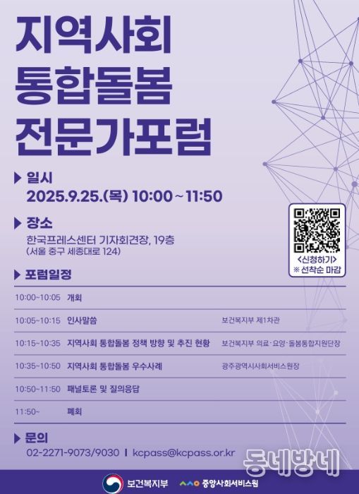 동네방네 김형규 기자 | 보건복지부와 중앙사회서비스원은 9월 25일 오전 10시, 한국프레스센터(서울시 중구 소재)에서 ‘지역사회 통합돌봄 정책 방향 및 추진현황’을 주제로 전문가 포럼을 개최했다.