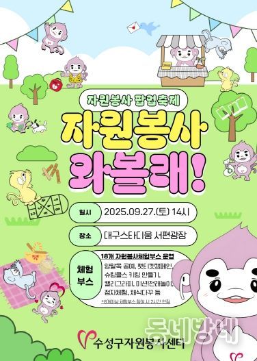동네방네 김형규 기자 | 대구 수성구자원봉사센터(센터장 이기덕)는 오는 27일 대구스타디움 서편광장에서 '자원봉사 팝업축제, 자원봉사 와볼래'를 개최한다. 이번 축제는 지역 주민들이 일상 속에서 자원봉사를 쉽게 체험하고, 자연스러운 참여 문화를 확산하기 위해 마련됐다.