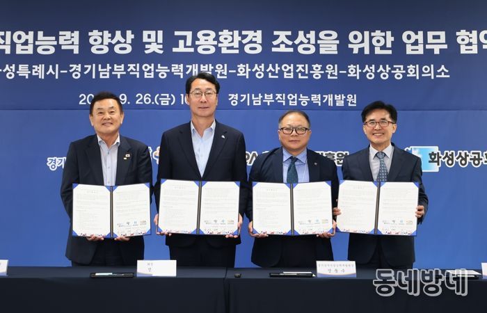동네방네 김형규 기자 | 화성특례시가 26일 경기남부직업능력개발원·화성상공회의소·화성산업진흥원과 ‘장애인의 직업능력 향상 및 장애친화형 고용 환경 조성을 위한 업무협약’을 체결했다.