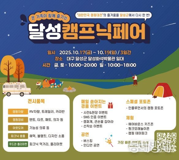 동네방네 김형규 기자 | 달성군은 오는 17일부터 19일까지 달성화석박물관 앞 광장에서 캠핑용품 전시·판매와 캠핑 문화를 체험할 수 있는 ‘달성캠프닉페어’를 개최한다고 밝혔다.