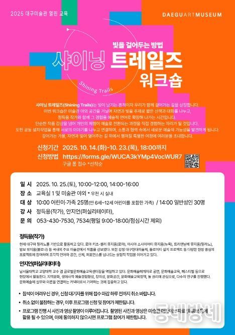 동네방네 김형규 기자 | 대구문화예술진흥원 대구미술관은 오는 10월 25일, 오전 10시, 오후 2시, 총 2회에 걸쳐 열린 교육 ‘샤이닝 트레일즈 워크숍: 빛을 걸어 두는 방법’을 운영한다.