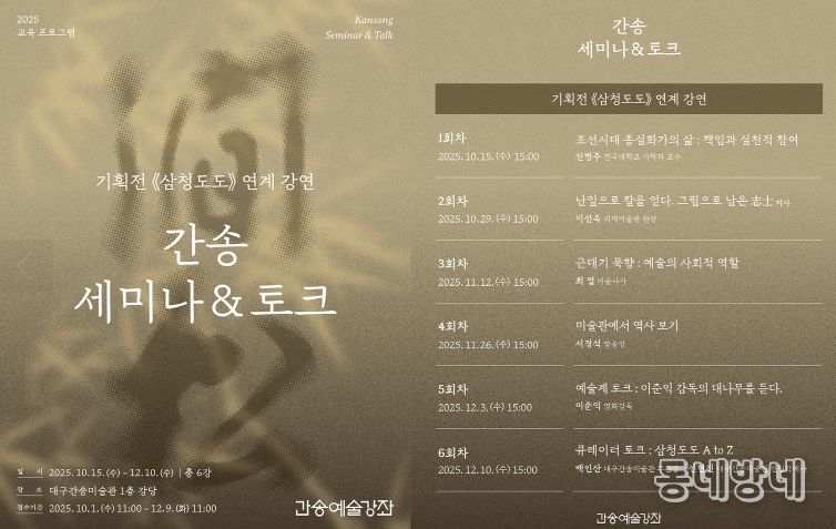 동네방네 김형규 기자 | 대구간송미술관은 광복 80주년 기념 기획전 《삼청도도 – 매·죽·난, 멈추지 않는 이야기》와 연계하여 ‘간송예술강좌: 세미나 · 토크’를 운영한다.