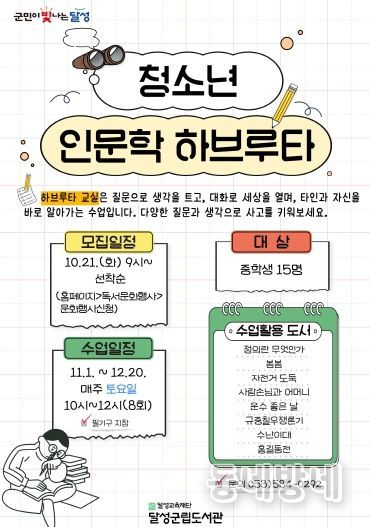 동네방네 김형규 기자 | 달성군립도서관이 오는 21일부터 중학생을 대상으로 한 인문학 독서토론 프로그램 ‘청소년 인문학 하브루타’ 참여자를 모집한다.