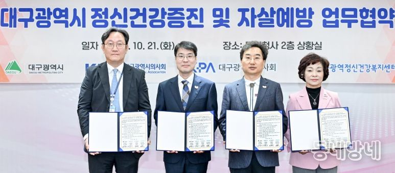 동네방네 김형규 기자 | 대구광역시는 10월 21일 오전 11시 동인청사 2층 상황실에서 ‘대구광역시 정신건강 증진 및 자살예방 업무협약’을 체결했다. 이번 협약은 대구 시민의 정신건강 증진과 자살 예방을 위한 지역사회 거버넌스 구축을 목표로 한다.