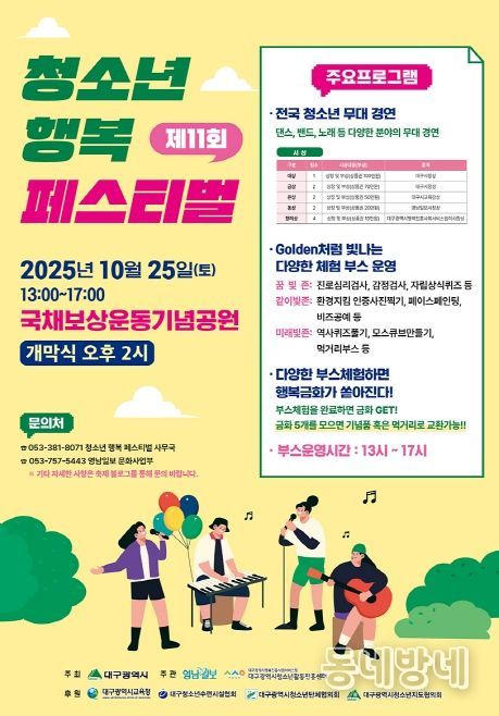 동네방네 김형규 기자 | 대구광역시는 10월 25일 오후 2시, 국채보상운동기념공원에서 ‘2025년 제11회 청소년 행복 페스티벌’을 개최한다.