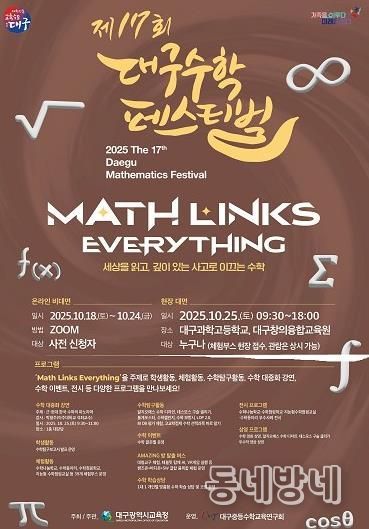 동네방네 김형규 기자 | 대구시교육청이 주최하고 대구중등수학교육연구회가 운영하는 ‘제17회 대구수학페스티벌’이 10월 25일 9시 30분부터 대구과학고 및 대구창의융합교육원에서 'Math Links Everything(수학은 모든 것을 연결한다)'이라는 주제로 개최된다.