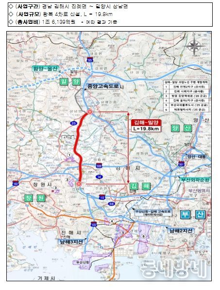 ➊김해~밀양 고속도로 신설은 경남 김해시 진례면 ~ 밀양시 상남면 19.8㎞ 구간 왕복 4차로를 신설하는 사업(총사업비 1.6조원)으로, 부산항신항 및 가덕도신공항의 접근성을 제고하고 대구·경남 지역 산업단지 물류 경쟁력 강화에 기여할 것으로 기대된다.