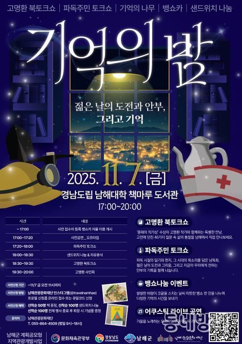 동네방네 김형규 기자 | ‘젊은 날의 도전과 안부, 그리고 기억’이라는 주제로 독일마을 기억의 밤 행사가 오는 11월 7일 17시부터 경남도립남해대학 책마루도서관에서 열린다.