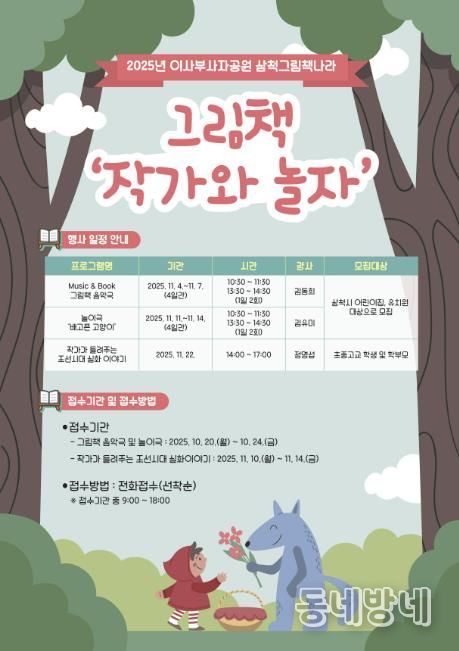 동네방네 김형규 기자 | 삼척시가 이사부사자공원 ‘그림책나라’에서 11월 4일부터 22일까지 그림책 작가와 전문 강사를 초빙해 ‘그림책 작가와 놀자’프로그램을 운영한다.
