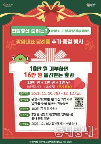 동네방네 김형규 기자 | 광양시가 연말정산 시기를 맞아 오는 11월 10일부터 12월 12일까지 고향사랑기부제에 참여한 기부자를 대상으로 광양 대표 답례품을 추가 증정하는 행사를 진행한다.