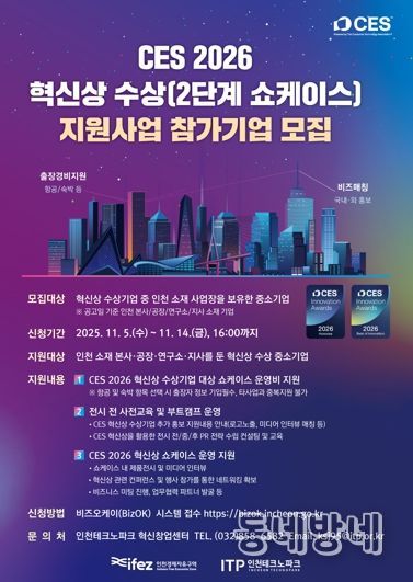 신청 대상은 CES 2026 혁신상을 수상한 인천 스타트업으로, 지원 내용은 ▲최대 400만원 운영비 지원 ▲전·중·후 단계별 PR 전략 수립 ▲CES 혁신상 수상기업 홍보 방안 등으로 구성된다. 접수는 11월 14일 16시까지 가능하다.