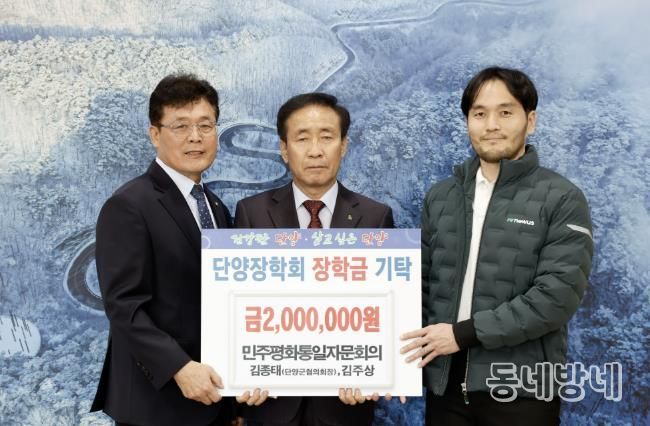 동네방네 김형규 기자 | 충북 단양군은 민주평화통일자문회의 단양군협의회 김종태 회장과 아들 김주상 씨가 지역 인재 양성을 위해 장학금 200만 원을 단양장학회에 기탁했다고 지난 7일 밝혔다.