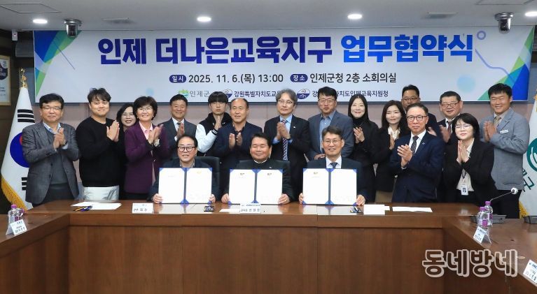 군은 최근 인제군청 소회의실에서 강원특별자치도교육청, 인제교육지원청과 함께 ‘더나은교육지구 재지정(3기) 업무협약’을 체결했다.