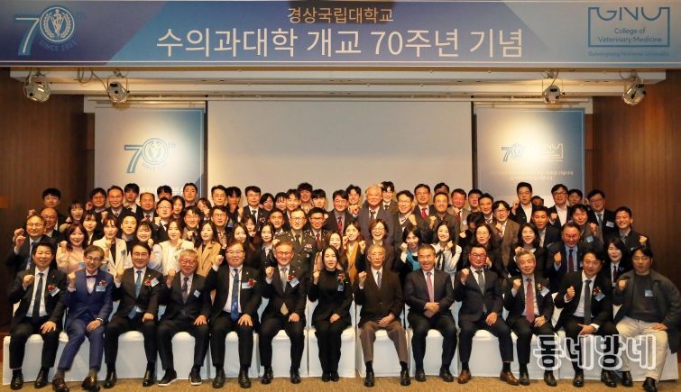 동네방네 김형규 기자 | 경상국립대학교 재경 수의과대학 동문회(회장 하지영)는 11월 6일 저녁 서울신라호텔 영빈관에서 ‘70년 개척의 자부심, 100년을 향한 새로운 비상’이라는 슬로건으로 ‘수의과대학 개교 70주년 기념행사’를 개최했다.