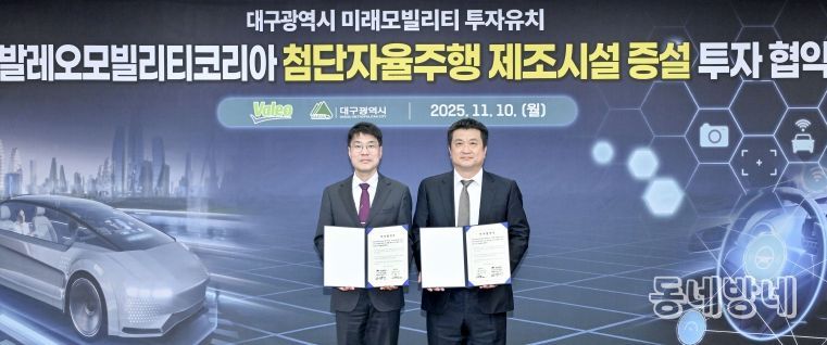 동네방네 김형규 기자 | 대구광역시는 11월 10일 시청 동인청사에서 발레오모빌리티코리아㈜(대표 김민규)와 첨단 자율주행 센서의 대량 양산체계 구축을 위한 공장 증설 투자협약을 체결했다.