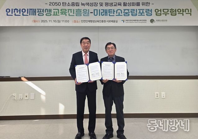 동네방네 김형규 기자 | 2025년 11월 10일, 인천인재평생교육진흥원과 미래탄소중립포럼이 탄소중립 시민교육과 평생교육 활성화를 위한 업무협약(MOU)을 체결했다.