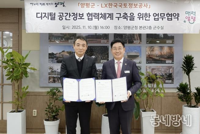 동네방네 김형규 기자 | 양평군은 지난 10일 LX한국국토정보공사와 ‘디지털 공간 정보 협력체계 구축을 위한 업무협약(MOU)’을 체결하고, 군민이 체감할 수 있는 스마트 행정 서비스 확대에 나섰다.