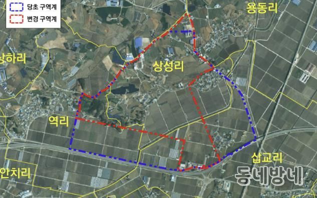 이번 조정은 사업구역 변경 사항을 반영한 것으로, 2023년 10월 23일 지정된 삽교읍 삽교리 일원 1177필지 166만6644㎡ 중 삽교리·상성리·역리 일원 412필지 67만5016㎡는 해제하고 용동리 7필지 947㎡는 추가 지정됐다.