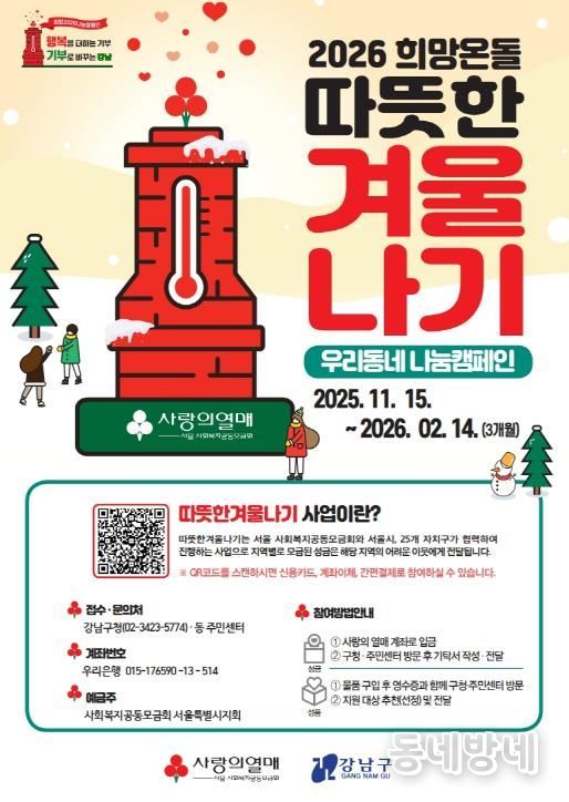 동네방네 김형규 기자 | 꿈이 모이는 도시, 미래를 그리는 강남구가 11월 15일부터 내년 2월 14일까지 3개월간 지역 내 소외된 이웃들에게 온기를 전하는 ‘2026 희망온돌 따뜻한 겨울나기’ 나눔 캠페인을 본격 추진한다. 선포식은 오는 11월 17일 구청 본관 1층 로비에서 열린다.