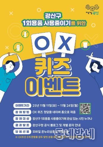 동네방네 김형규 기자 | 광주 광산구가 일상에서 일회용품 사용을 줄이기 위한 시민들의 인식 개선과 친환경 실천 확산을 위해 ‘일회용품 사용 줄이기 OX 퀴즈 행사’를 진행한다.