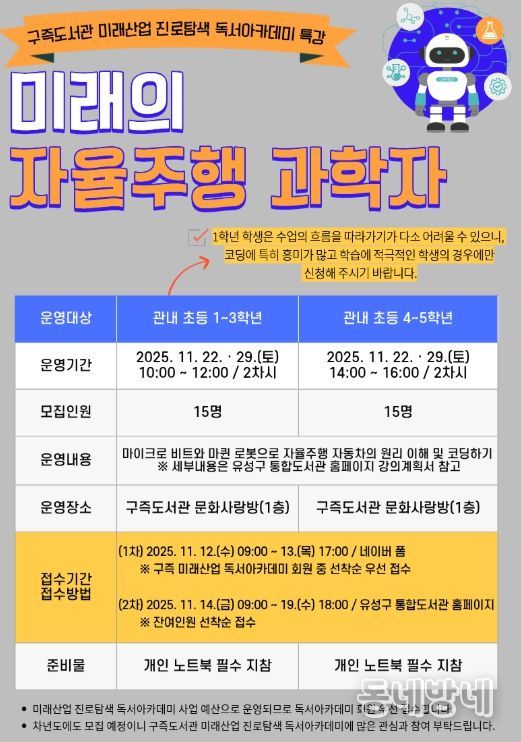 동네방네 김형규 기자 | 대전 유성구 오는 22일과 29일 구즉도서관에서 관내 초등학생을 대상으로 ‘미래의 자율주행 과학자’ 과학 특강을 운영한다.