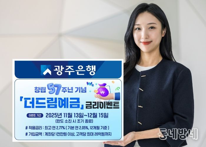 동네방네 김형규 기자 | 광주은행은 창립 57주년을 맞아 고객들의 성원에 감사의 뜻을 전하고자, 이자를 더 드리는 ‘창립 57주년 더드림예금 금리 이벤트’를 실시한다고 밝혔다.