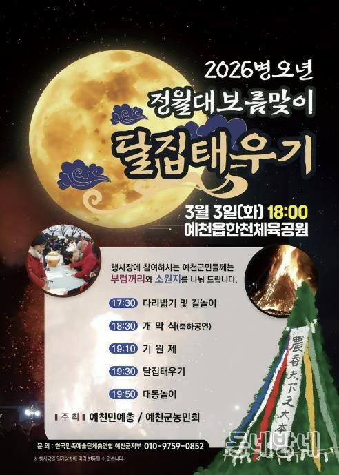 동네방네 김형규 기자 | 예천군은 오는 3월 3일 오후 5시 30분에 예천읍 한천체육공원에서 ‘2026년 병오년 정월대보름 달집태우기 행사’를 개최한다고 밝혔다.