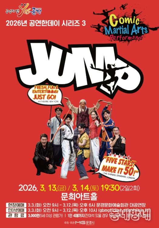 동네방네 김형규 기자 | 문경문화예술회관에서는 화려한 공중회전을 선보이는 아크로바틱과 고난이도 동양 무예, 슬랩스틱 코미디가 어우러진 넌버벌 퍼포먼스 점프(JUMP) 공연을 3월 13일 19:30, 14일 19:30 (2일 2회)에 문희아트홀에서 개최한다.