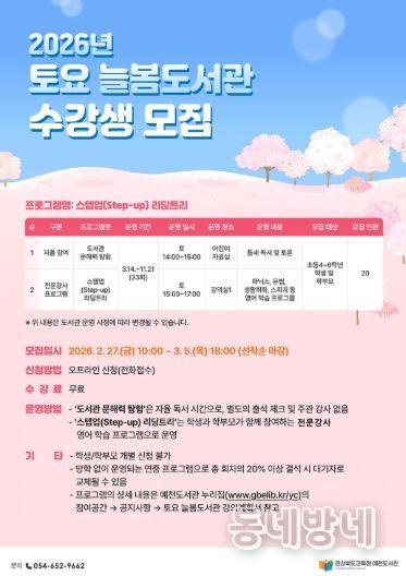동네방네 김형규 기자 | 경상북도교육청 예천도서관은 지역 어린이들의 문해력 향상과 영어 학습 역량 강화를 지원하기 위해 2026년 토요 늘봄도서관 수강생을 모집한다.