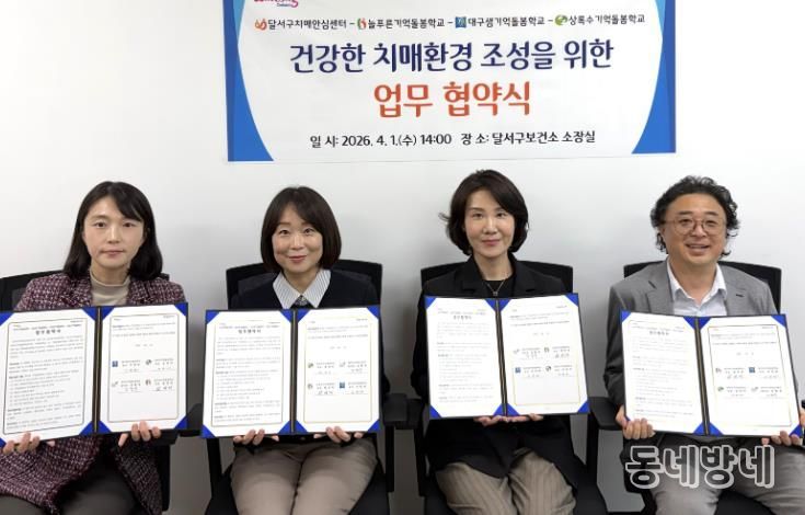 동네방네 김형규 기자 | 대구 달서구는 지난 1일 늘푸른기억돌봄학교, 대구샘기억돌봄학교, 상록수기억돌봄학교와 업무협약을 체결하고, 인지저하 및 경증치매 어르신을 위한 통합돌봄 체계 구축에 나선다.