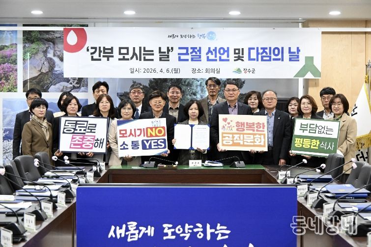 동네방네 김형규 기자 | 장수군은 6일 군청 회의실에서 공직사회 내 불합리한 관행을 개선하고 수평적인 조직문화를 정착시키기 위한 ‘간부 모시는 날’ 근절 선언 및 다짐의 날 행사를 개최했다고 밝혔다.