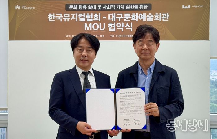 동네방네 김형규 기자 | (재)대구문화예술진흥원 대구문화예술회관은 한국뮤지컬협회와 업무협약(MOU)을 체결하고, 창작 뮤지컬 발전과 글로벌 네트워크 강화를 위해 협력하기로 했다.