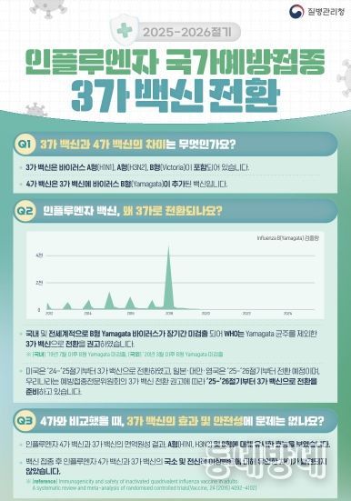 이번 인플루엔자 예방접종은 최근 바이러스 미검출 현황과 세계보건기구(WHO) 권고를 반영해 기존 4가 백신에서 3가 백신으로 변경되어 시행된다. 질병관리청은 3가 백신이 효과성과 안전성 면에서 기존 4가 백신과 차이가 없는 것으로 확인됐다고 설명했다.