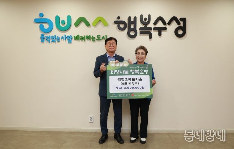 동네방네 김형규 기자 | 대구 수성구는 15일 자활기업 ㈜청소하는마을(대표 박정옥)이 관내 어려운 이웃들을 위해 성금 300만 원을 전달했다고 밝혔다.