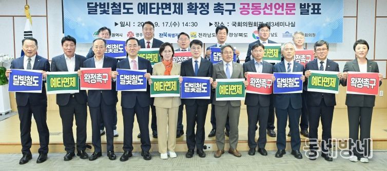 동네방네 김형규 기자 | 김정기 대구광역시장 권한대행 행정부시장은 달빛철도가 경유하는 광역자치단체장 및 지역 국회의원들과 함께 9월 17일(수) 국회에서 달빛철도 건설 사업의 예비타당성조사(예타) 면제 확정을 촉구하는 공동선언문을 발표했다.