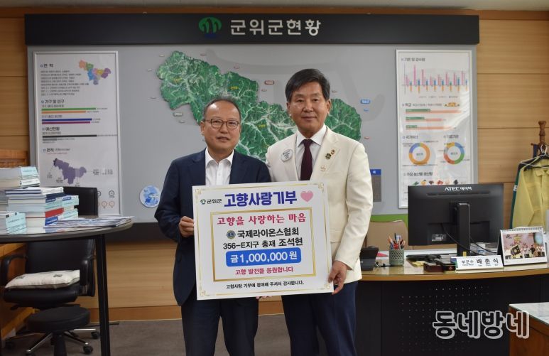 동네방네 김형규 기자 | 군위군은 국제라이온스협회 356-E(경북)지구 조석현 총재(제38대)가 지난 23일 군위군청을 방문하여 고향사랑기부금 100만원을 전달했다고 밝혔다.