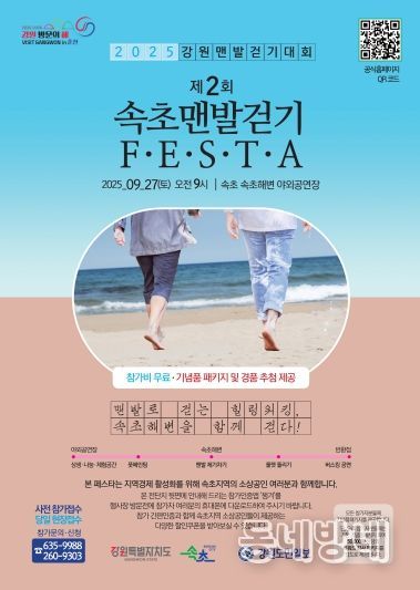 동네방네 김형규 기자 | 속초시는 강원특별자치도 및 강원도민일보와 함께 오는 9월 27일 속초해수욕장에서 외옹치해수욕장 구간을 따라 ‘제2회 2025 속초시 강원 맨발걷기 대회’를 연다. 지난해에 이어 두 번째로 마련되는 이번 대회는 자연 속에서 맨발로 걸으며 건강과 힐링을 동시에 경험할 수 있는 특별한 축제다.