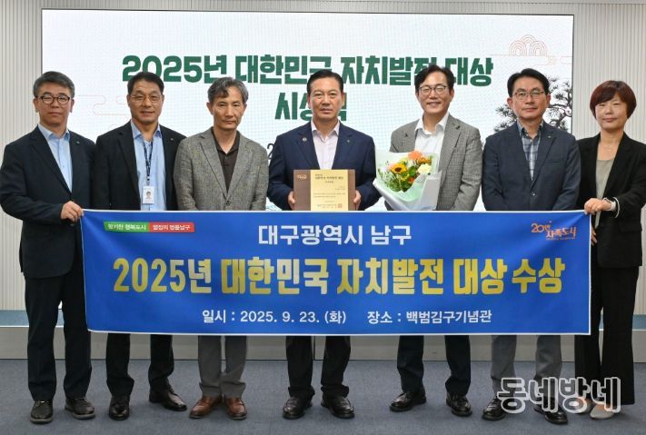 동네방네 김형규 기자 | 대구 남구는 지난 23일 서울 용산구 백범김구기념관 컨벤션홀에서 열린 '2025 대한민국 자치발전 대상'에서 기초부문 대상을 수상했다.