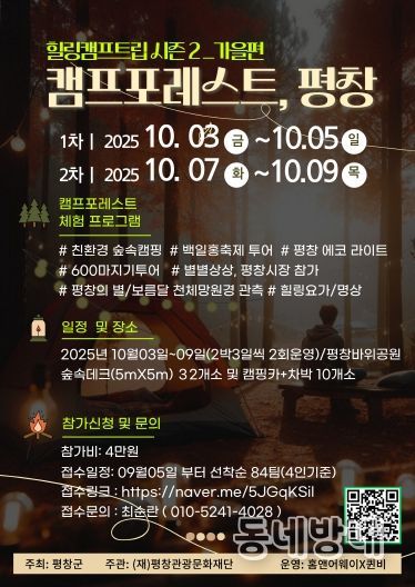 동네방네 김형규 기자 | 평창관광문화재단은 바위공원 힐링 프로그램 운영 사업을 통해 가을철 자연 속 힐링과 체험을 결합한 가족 단위 캠프 프로그램, '캠프포레스트, 평창'의 참가자를 모집한다. 행사는 오는 10월 3일부터 9일까지 평창군 평창읍 바위공원 일대에서 진행된다.