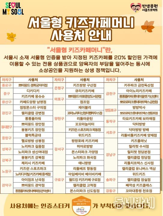 동네방네 김형규 기자 | 열흘 안팎의 긴 추석연휴를 앞두고 아이들과 양육자가 보다 부담 없는 가격으로 키즈카페에서 즐거운 연휴를 보낼 수 있도록 서울시가 20% 할인 혜택이 있는 ‘서울형 키즈카페머니’ 11억 원을 추가 발행한다고 밝혔다.