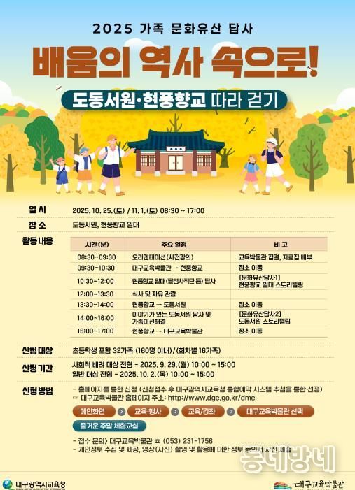 동네방네 김형규 기자 | 대구교육박물관은 오는 10월 25일과 11월 1일, 두 차례에 걸쳐 초등학생 가족들을 대상으로 ‘배움의 역사 속으로! 도동서원·현풍향교 따라 걷기’가족문화유산답사 프로그램을 운영한다.