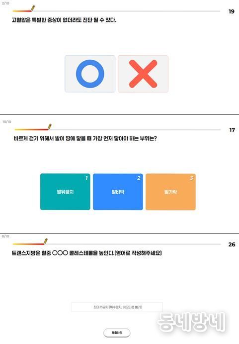 참가자들은 모바일과 PC로 퀴즈쇼 URL 링크에 접속하여 심뇌혈관질환 예방, 금연, 건강한 식습관, 바르게 걷기, 치아 관리 등 만성질환을 조기에 예방할 수 있는 다채로운 건강 퀴즈를 풀며 재미와 유익함을 동시에 경험했다.