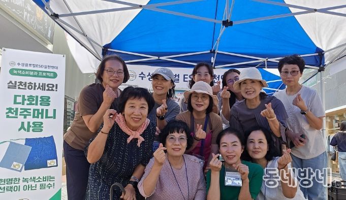 천주머니에는 수성구 캐릭터 ‘뚜비’ 라벨을 회원들이 직접 부착했으며, 시민들에게 배포하며 일회용 비닐봉투 사용을 줄이기 위한 홍보 활동을 전개했다.