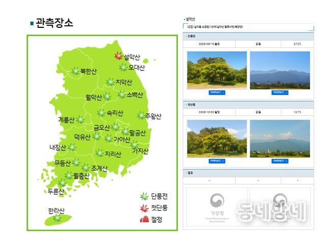 기상청에서는 기상청 날씨누리를 통해 전국 21개 주요 유명산의 단풍현황을 제공하고 있다. 특히 △단풍 전 △단풍 시작 △단풍 절정 시 촬영한 사진을 지도와 함께 제공하여, 누구나 단풍 실황을 살펴볼 수 있다.
