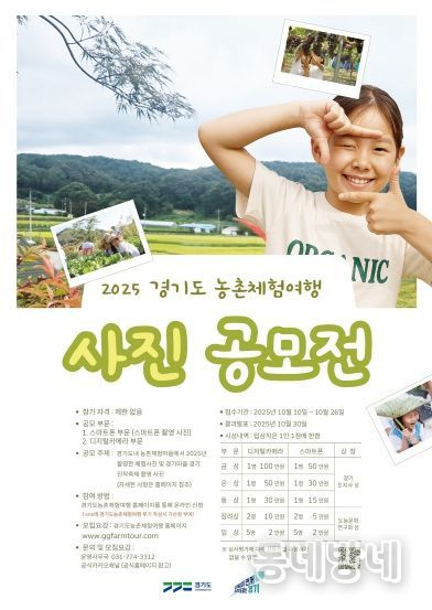 동네방네 김형규 기자 | 경기도가 농촌 지역의 매력을 널리 알리고 체험관광을 활성화하기 위해 ‘2025 경기도 농촌체험여행 사진 공모전’을 개최한다. 공모전 접수는 10월 10일부터 26일까지며, 스마트폰과 디지털카메라 두 부문으로 진행된다.