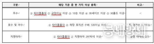 KBO 정규시즌 개인 부문별 1위 선수는 자격요건에 관계없이 기준이 충족된 포지션의 후보로 자동 등록된다. 단, 타이틀홀더에 한해 여러 포지션 출전으로 어느 포지션에서도 수비이닝 기준을 충족하지 못했을 경우, 최다 수비이닝을 소화한 포지션의 후보가 된다. 수비이닝과 지명타자 타석을 비교해야 할 경우에는 각 해당 기준 대비 비율이 높은 포지션의 후보로 등록된다.