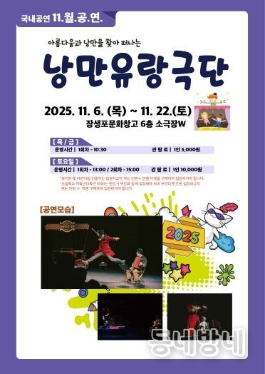 동네방네 김형규 기자 | 고래문화재단(이사장 서동욱)은 11월 6일부터 22일까지 어린이를 위한 상설공연으로 ‘낭만 유랑극단’을 총 12회에 걸쳐 무대에 오른다고 밝혔다.