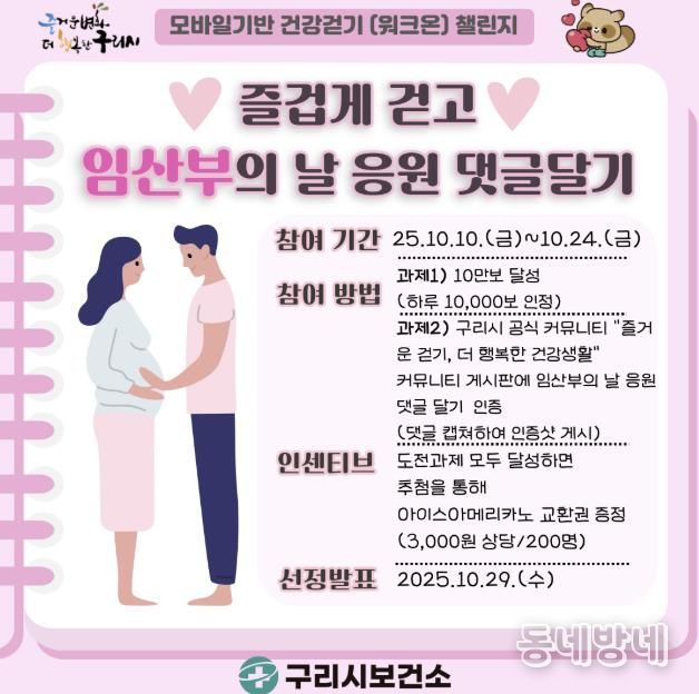 동네방네 김형규 기자 | 구리시는 제20회‘임산부의 날’(10월 10일)을 기념해 임신과 출산의 가치를 되새기고 시민 건강 증진을 도모하기 위한 ‘즐겁게 걷고, 임산부의 날 응원 댓글 달기’ 챌린지를 오는 10월 10일부터 24일까지 15일간 운영한다고 밝혔다.